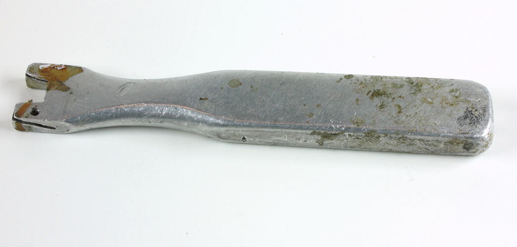 This tool was made by Doug Kite for thinning leather for braiding. It is made from aluminium and filed with two widths and depths. Doug used it by holding a stanley (utility) knife and pulling the leather toward him while it was held in a vice at the other end. This would involve Doug walking backwards for the desired length. Every braider uses different methods to thin leather.