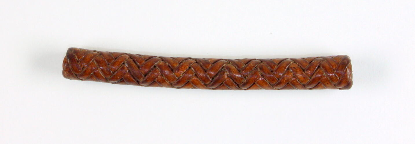 This sample of leather braiding was made by Doug Kite using kangaroo hide and a herringbone design using an 'over 3, under 3' method. It was worked over a cane rod and was used by Doug to test and refine his ideas. It is an example of a knot used for whip handles.