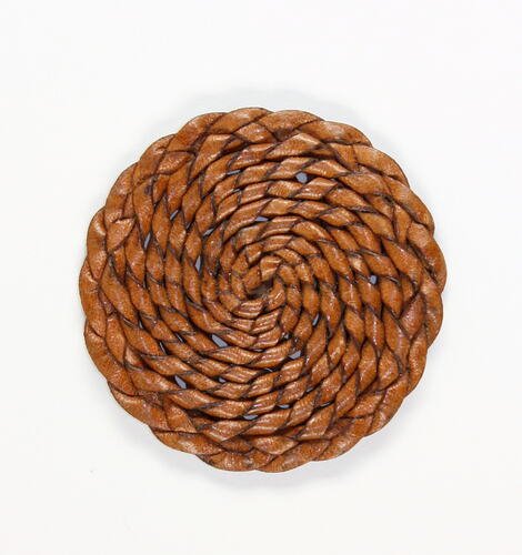 This item was braided by Doug Kite using kangaroo hide. It uses a fish scale design with a 3 plait edge. Doug made this to test an idea for drinking coasters.