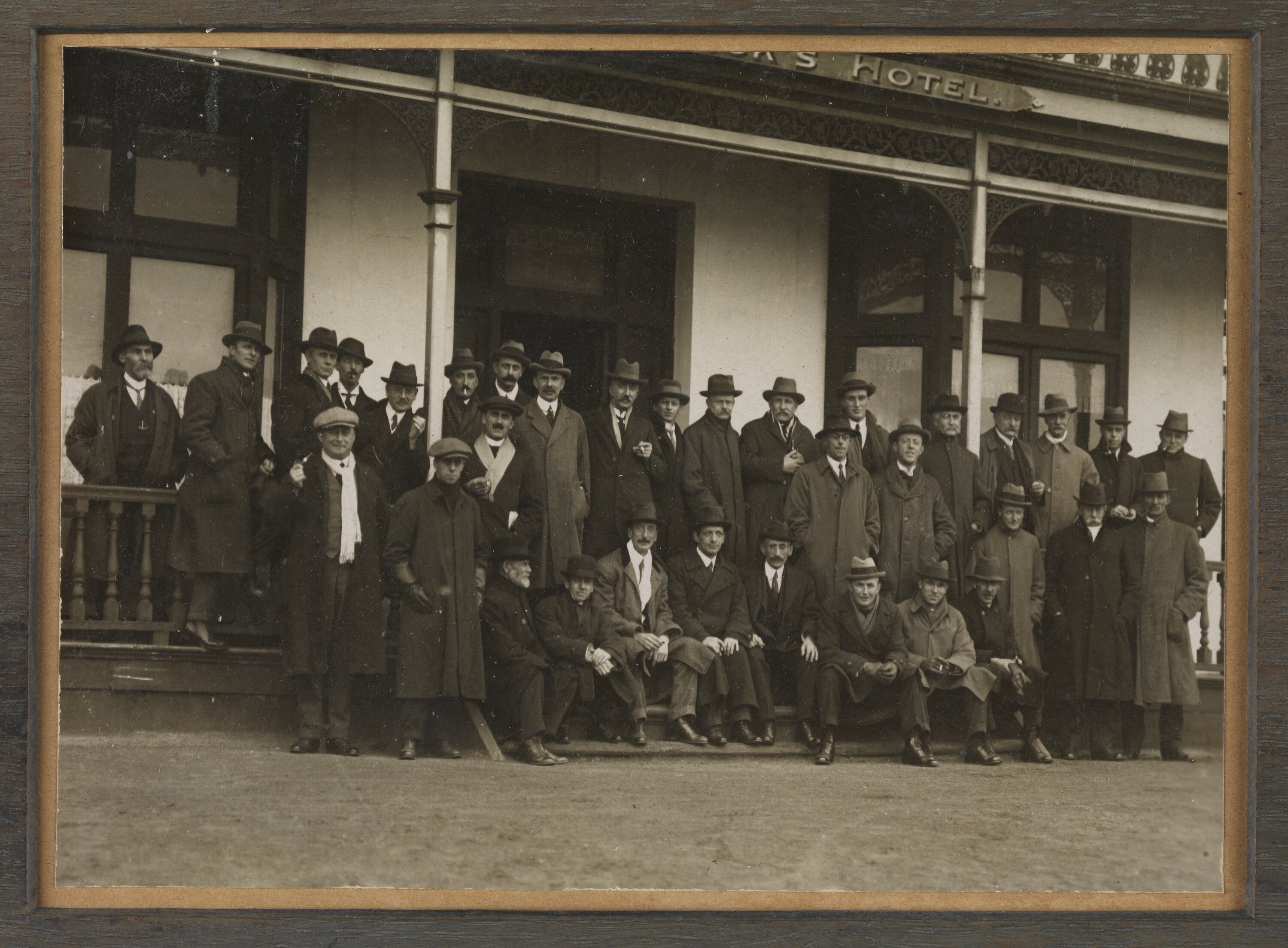 Group of men in coats and hats posing on the steps of a hotel.