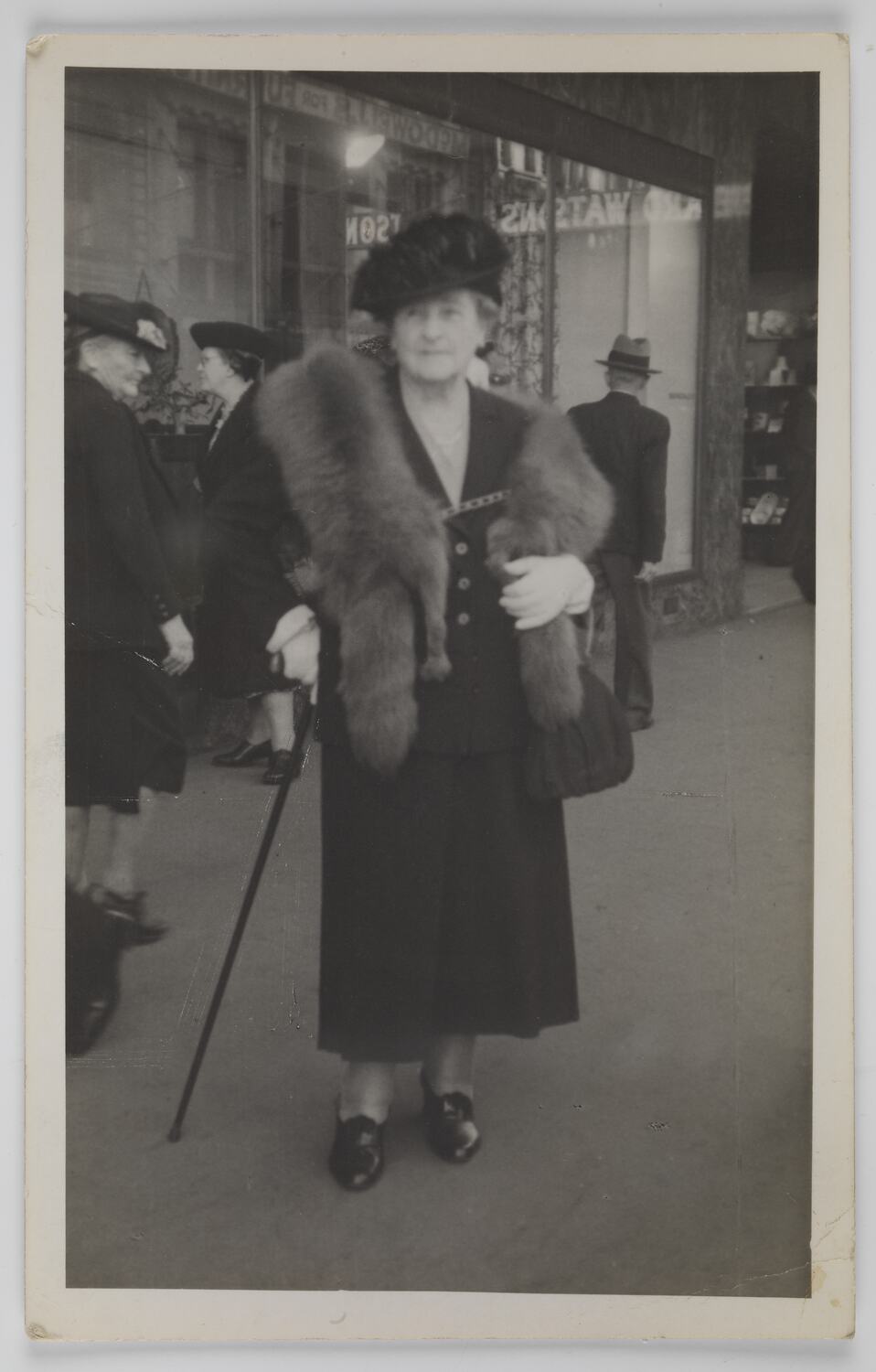 Older woman in skirt suit, with an ornate hat, fox stole, white gloves and a walking stick on a street with pedestrians outside a shop window display and entrance. The other pedestrians in the background are older women and an older man, dressed in coats and hats.