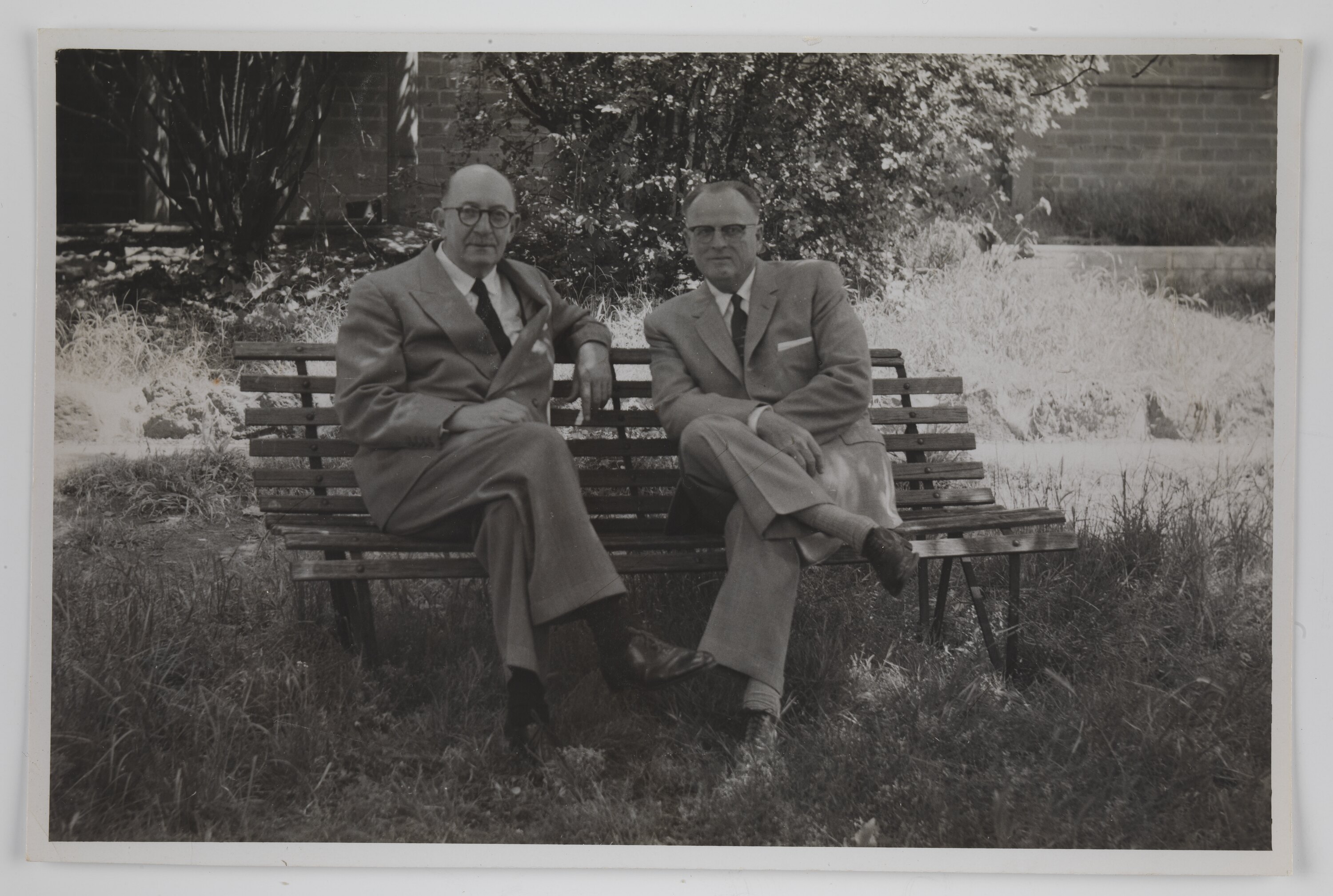 Two men in grey suits and ties, both wearing glasses, seated on wooden bench in the shade in a grassy garden. Brick building and shrubs visible in background.