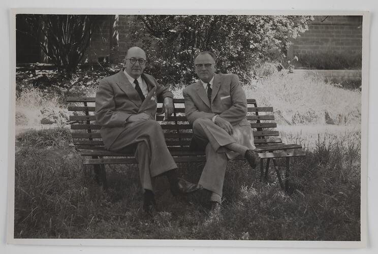Edgar Rouse, Managing Director of Kodak Australasia Pty Ltd, and another Kodak manager (name unknown) seated on a bench in the grounds of the Kodak factory in Abbotsford, circa 1950s.