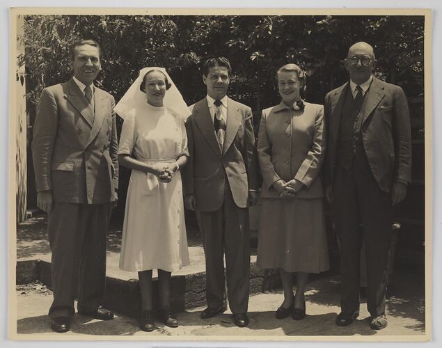 Left to right: Henry Foote, nursing sister (possibly Sister McBean), unknown, Dorothy Jeffries (possibly), Edgar Rouse.