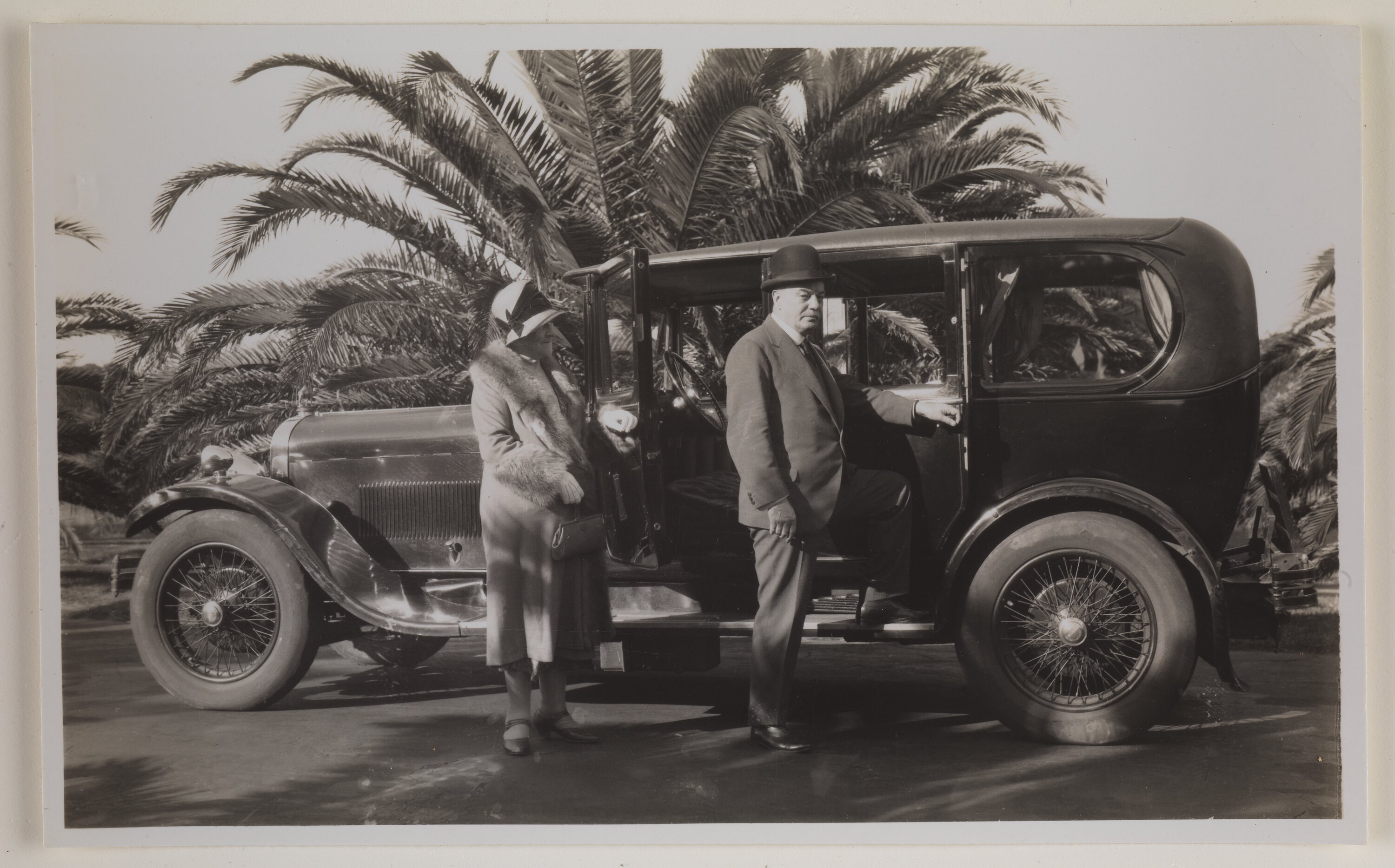 Man and woman leaning on a parked car, with palm trees behind them. Woman has her hand on an open door and is looking at man who has his elbow in the front window. Woman is wearing a fur coat and hat, and is holding a handbag. Man is wearing a bowler hat, suit and tie.