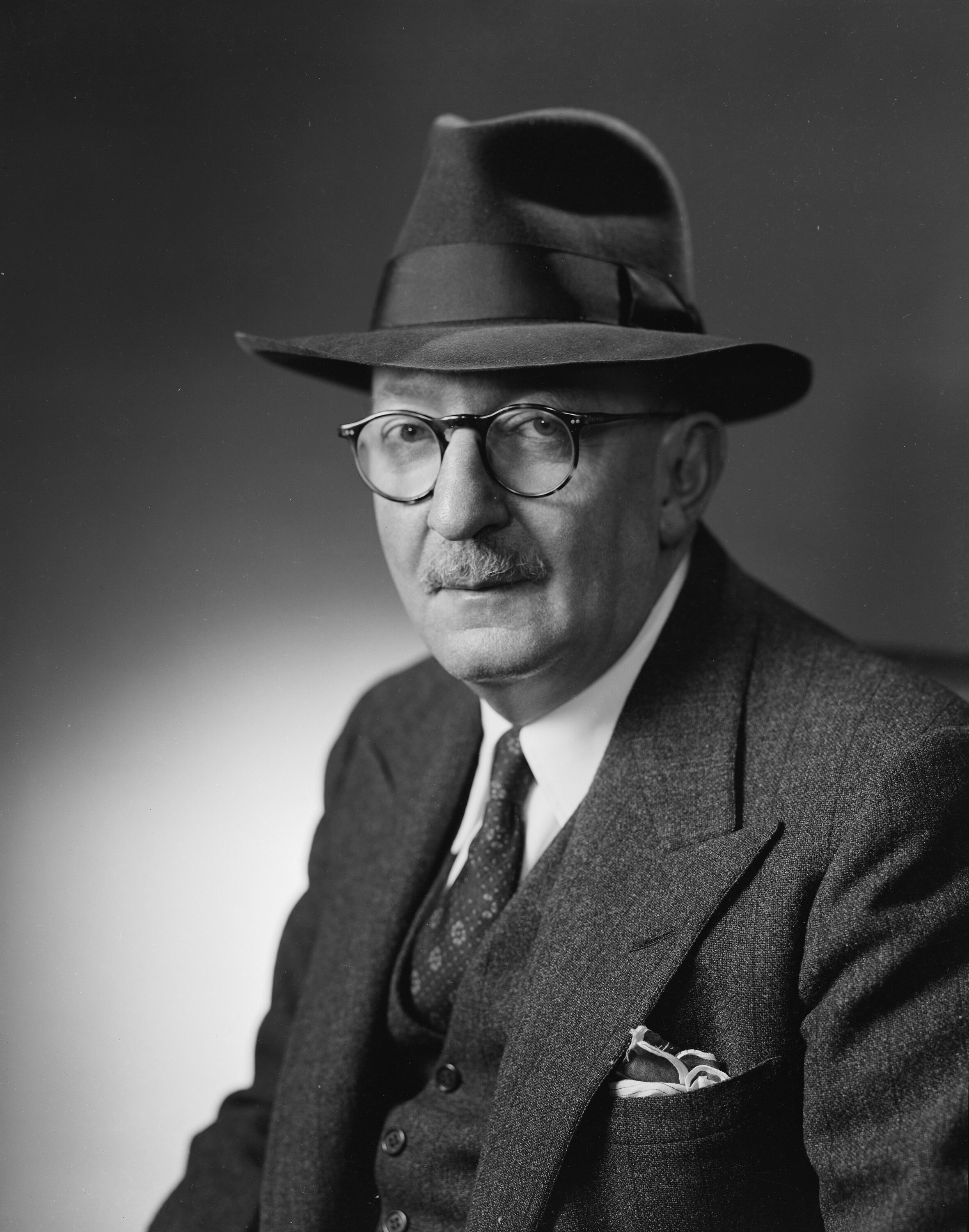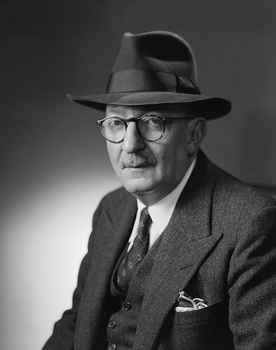 Head and shoulders photographic portrait of man in suit, hat and tie with handkerchief in his pocket. He has a moustache and wears glasses.