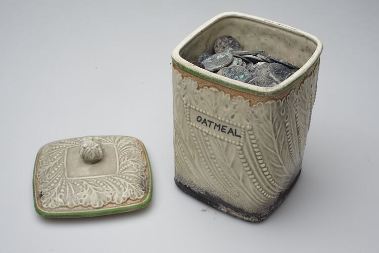 The oatmeal canister is a precious memento which belonged to the donor's grandmother. The donor used this canister to collect coins retrieved from the burnt remains of his home. The coins also held important personal meaning. They belonged to the donor and his father; the donor's father passed away in 1979 when the donor was 6 years old. The coins were a valuable collection.