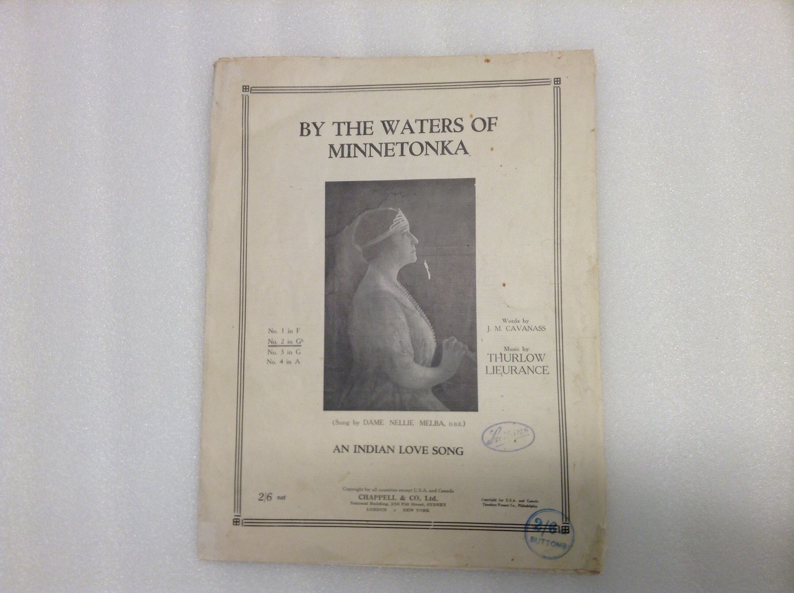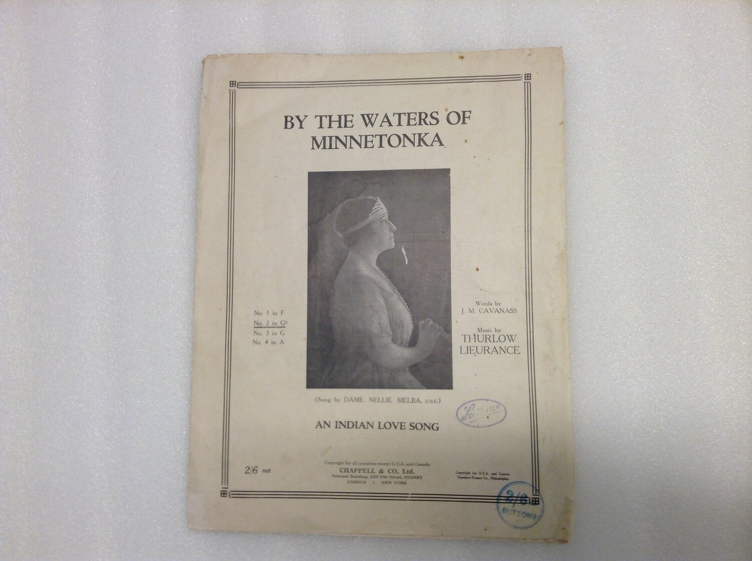 Printed in black ink on cover: BY THE WATERS OF / MINNETONKA / Words by / J. M. CAVANASS / Music by / THURLOW / LIEURANCE / (Sung by DAME NELLIE MELBA, E.B.E.) / AN INDIAN LOVE SONG