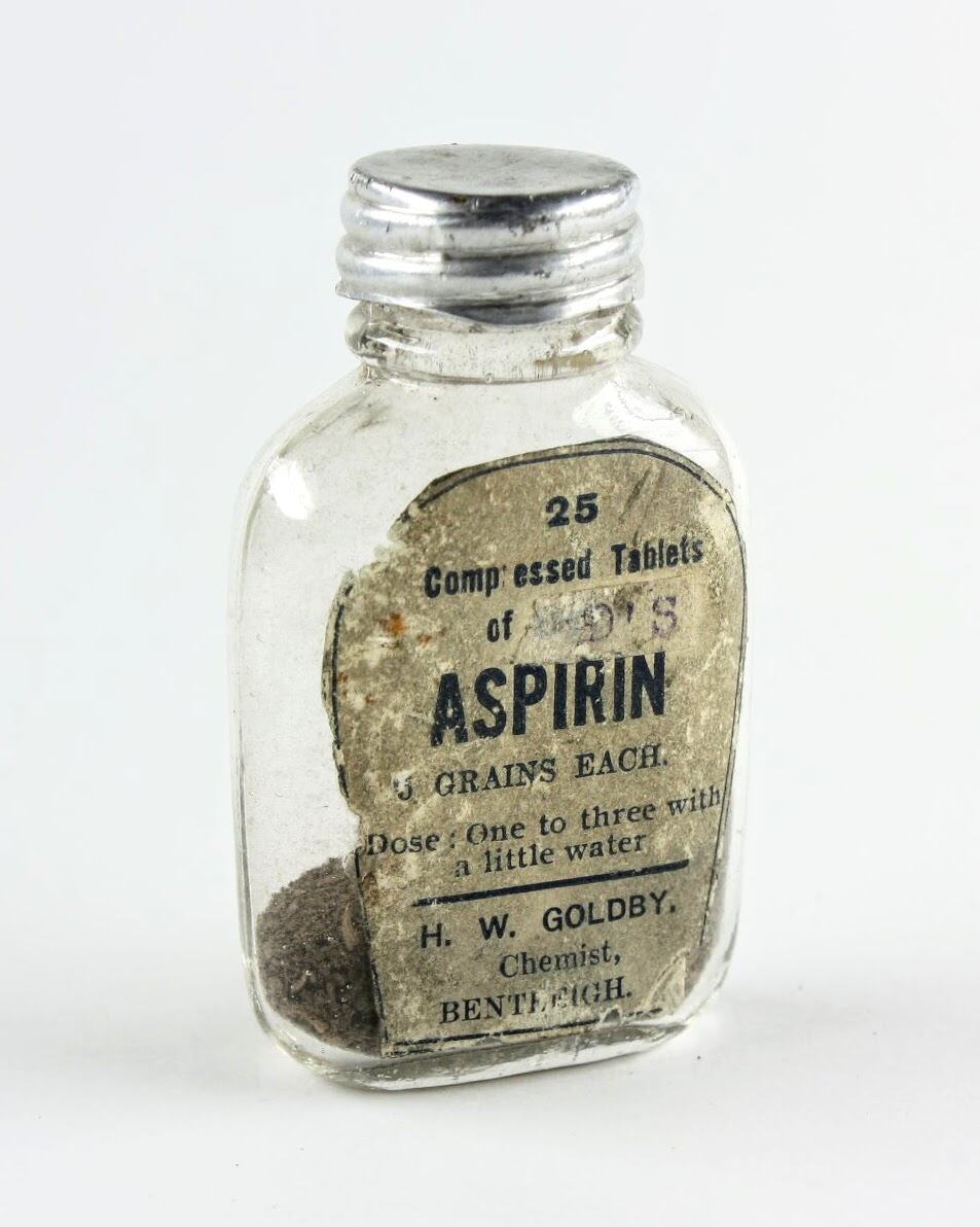 Front printed in black ink: 25 / Comp[r]essed Tablets / of / ASPRIN / 3 GRAINS EACH / Dose : One to Three with / a little water / H.W.GOLDBY, / Chemist, / BENTLEIGH Handwritten on tape adhered to bottle: D S