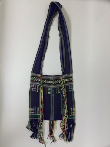 Cotton bag, blue dyed cloth of fine weave, with green and white stripes along bag and strap. Embroidered with coloured wools with wool strands hanging from bag opening. tassels at bottom of bag.