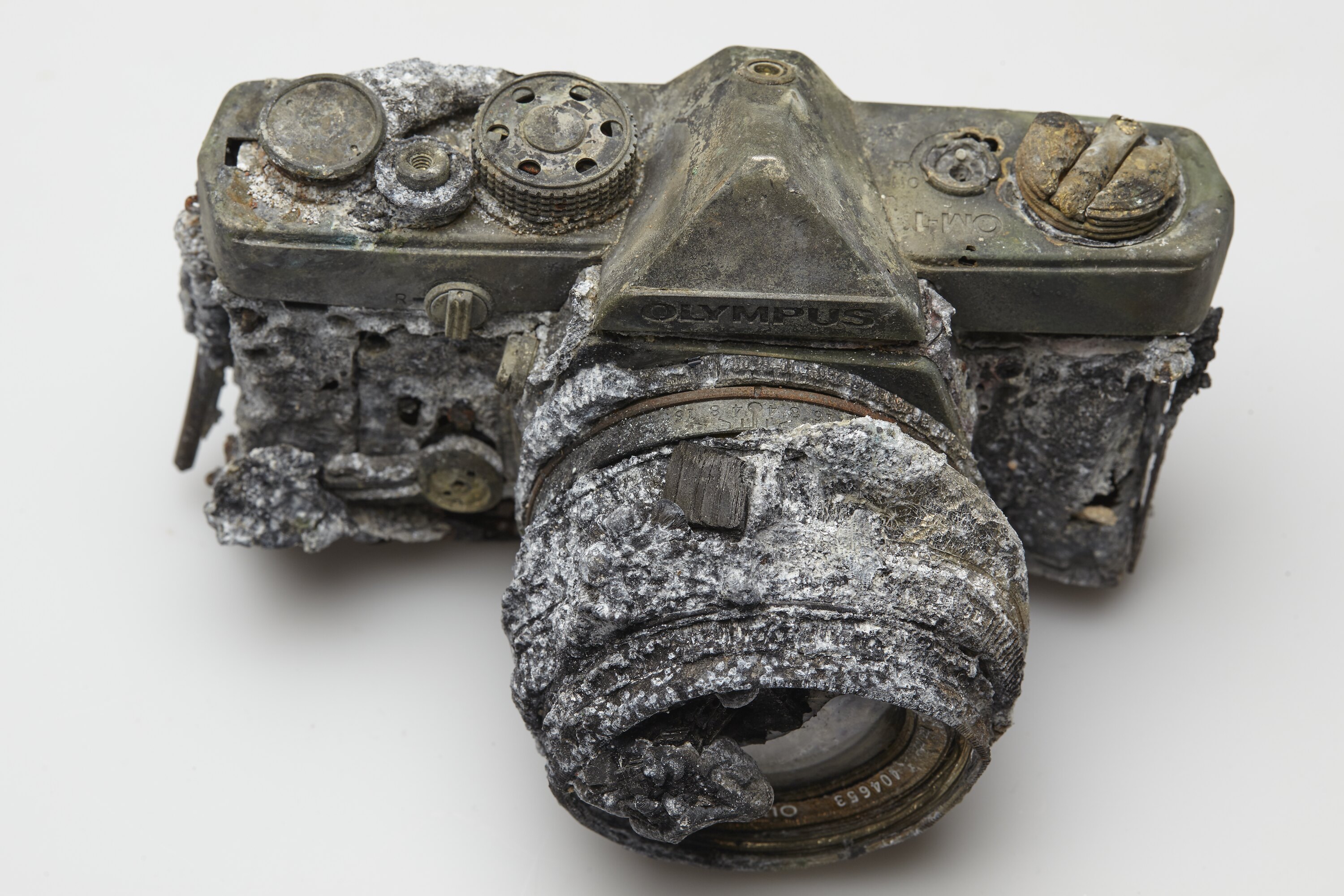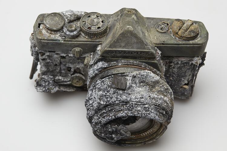 Bushfire-damaged camera, which is part of a collection of approximately 25 bushfire affected items retrieved by the donor Matt Parsons from his home in Kinglake in the aftermath of the 2009 Victorian Bushfires. These items represent all that remained of his home and possessions.