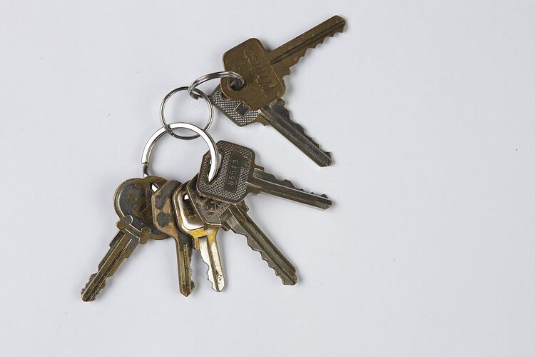 The donor commented on the keys: 'The keys were on my key ring. They include the house keys and a key to a steering wheel club lock. Looking at them now, one of them might have been a key to a case or a pad lock. I can't really remember now. I kept the keys because they reminded me of my home that I no longer had. The keys opened locks to doors that no longer existed. The doors, windows, interior walls and doors were all gone after the fires went through. I kept the keys because I just couldn't contemplate letting go of them'.