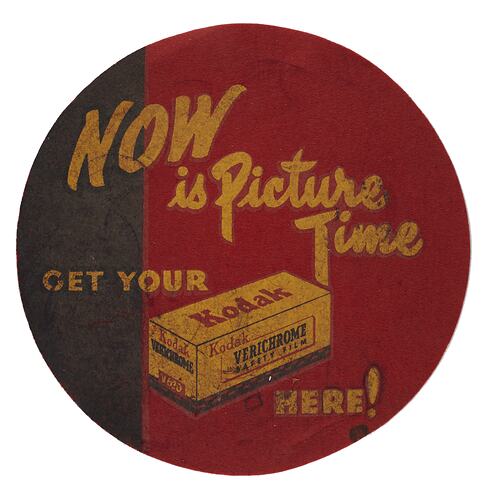 A red felt point-of-sale counter mat produced by Kodak Australasia. The mat includes the slogan 'Now is Picture Time. Get your Kodak Verichrome here!'.