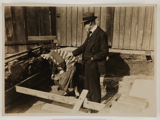 This photograph was previously housed in a Kodak branded photo wallet along with six black and white sheet negatives. Images depict the ceremonial laying of the first brick at Abbotsford and a portrait of a man holding a bag and leaning on a walking stick. The five negatives and one photograph depicting the brick laying ceremony relate to other photographs mounted in album HT 43508.