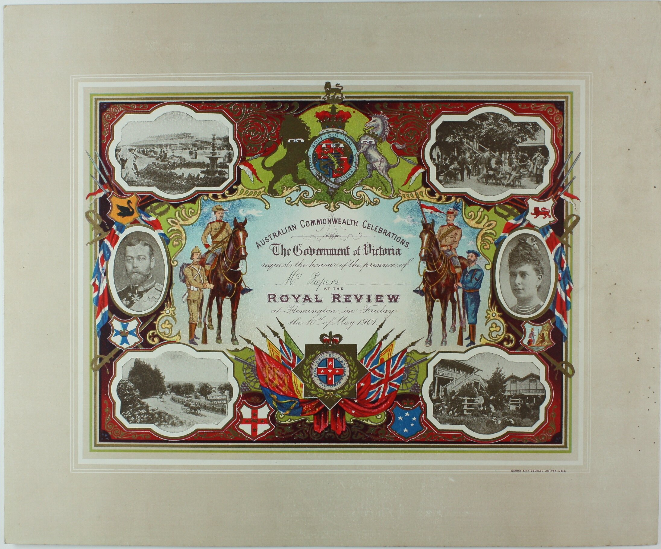 Invitation addressed to Mrs Peipers from the Government of Victoria. The invitation invites the pair to the Royal Review at Flemington as part of the Australian Commonwealth Celebrations on Friday, 10 May 1901.
