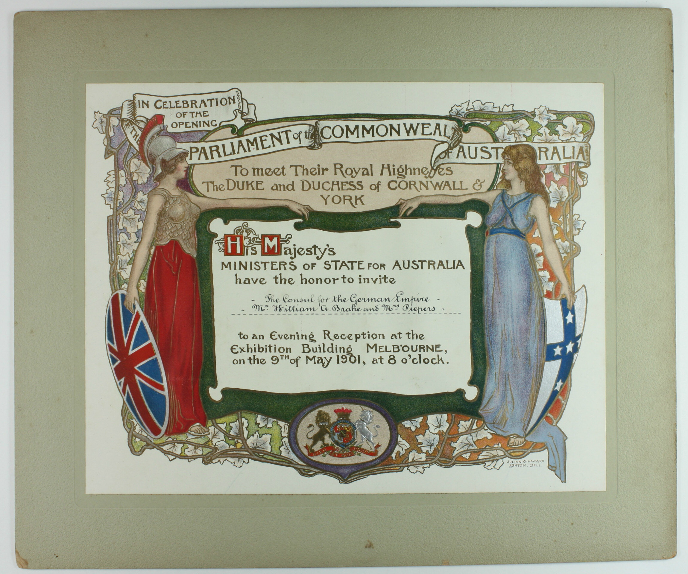 Invitation addressed to the Consul for the German Empire Mr. William A. Brahe and Mrs. Peipers from His Majesty's Ministers of State for the Commonwealth of Australia. The invitation invites the pair to an Evening Reception at the Exhibition Building to meet their Royal Highnesses The Duke and Duchess of Cornwall and York as part of the Australian Commonwealth Celebrations on the 9th May 1901.