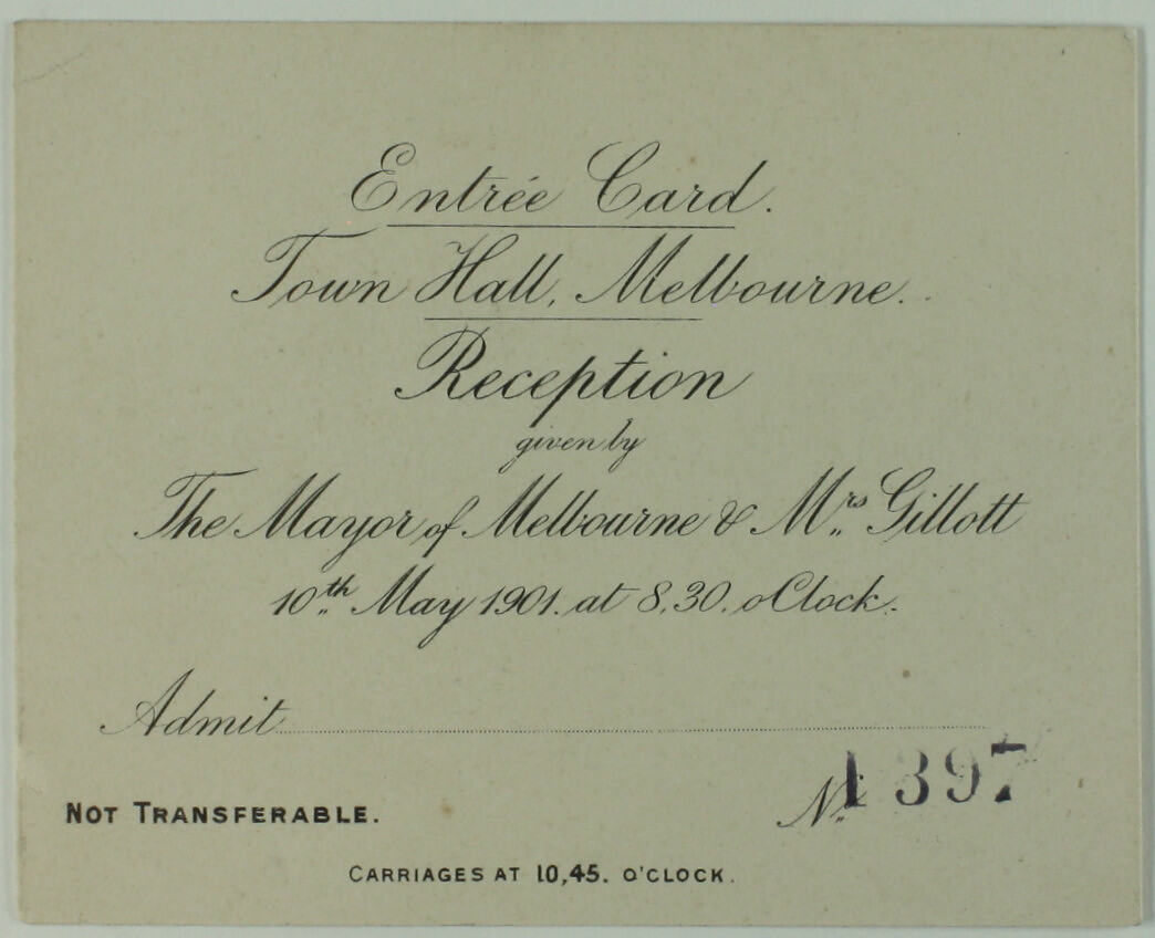 Printed on card: 'Entree Card. / Town Hall, Melbourne. / Reception / given by / The Mayor of Melbourne & Mrs Gillott / 10th May 1901, at 8:30 o'Clock. / Admit............................. / NOT TRANSFERABLE N 1 397 / CARRIAGES AT 10,45 O'CLOCK'