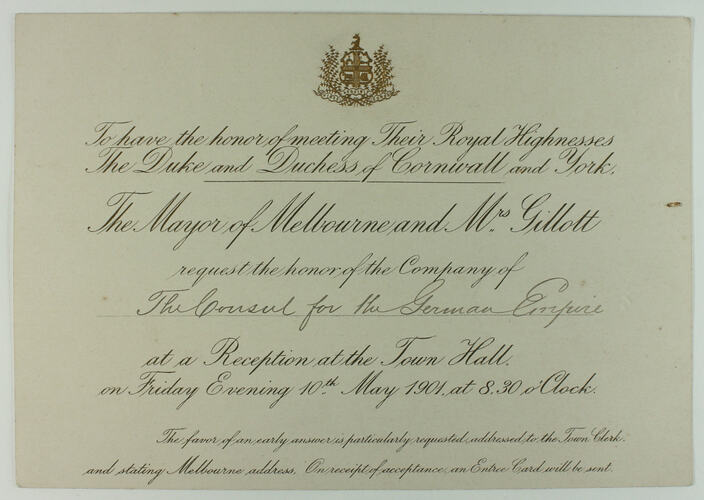 Printed on card: 'To have the honor of meeting Their Royal Highnesses / The Duke and Duchess of Cornwall and York, / The Mayor of Melbourne and Mrs Gillott / request the honor of the Company of / [handwritten] The Consul for the German Empire / at a Reception at the Town Hall / on Friday Evening 10th May 1901, at 8:30 o'Clock. / The favor of an early answer is particularly requested to the Town Clerk / and stating Melbourne address, On receipt of acceptance an Entree Card will be sent.'