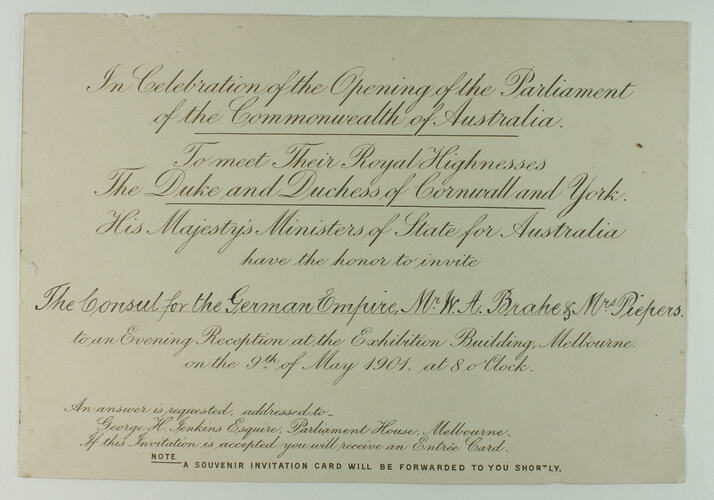 Printed on card: 'In Celebration of the Opening of the Parliament / of the Commonwealth of Australia / To meet Their Royal Highness / the Duke and Duchess of Cornwall and York / His Majesty's Ministers of State for Australia / have the honor to invite / [handwritten] The Consul for the German Empire, Mr. W. A. Brahe & Mrs. Piepers [sic] / to an Evening Reception at the Exhibition Building, Melbourne. / on the 9th of May 1901, at 8 o'Clock. / An answer is requested, addressed to - / George H. Jenkins Esquire, Parliament House, Melbourne. / If this Invitation is accepted you will receive an Entree Card. / NOTE A SOUVENIR INVITATION CARD WILL BE FORWARDED TO YOU SHORTLY.'.