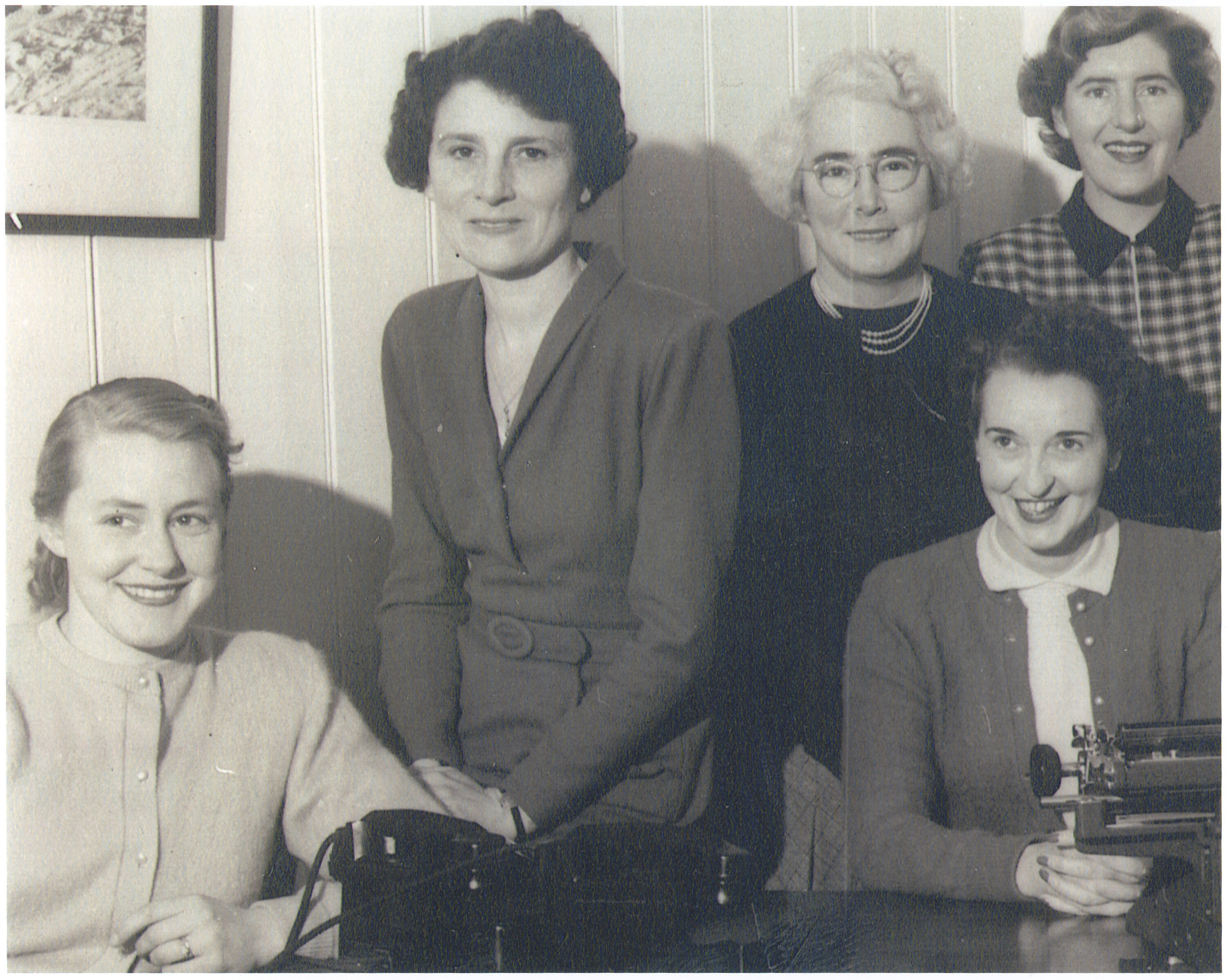 Black and white copy photograph of Dr Nellie Fisher with four other female Kodak employees. Dr Fisher is 2nd from the left, and third from the left is Nell Cameron.