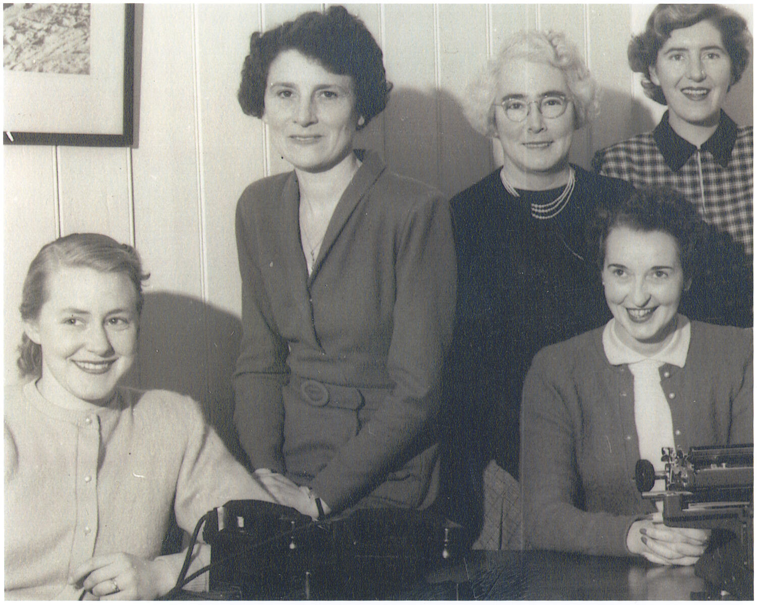Portrait of five women positioned behind a desk. Two of the women are seated at the desk, there are two telephones and a typewriter in front of them.
