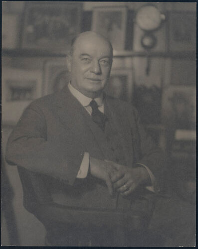 Black and white photographic portrait featuring Kodak Australasia Pty Ltd managing director John Joseph (J.J.) Rouse circa 1925-1935. It appears to have been taken in his study, with family portraits displayed behind him.
