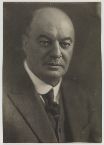 Portrait of older man in 3 piece suit with tie. He has a moustache and is balding.