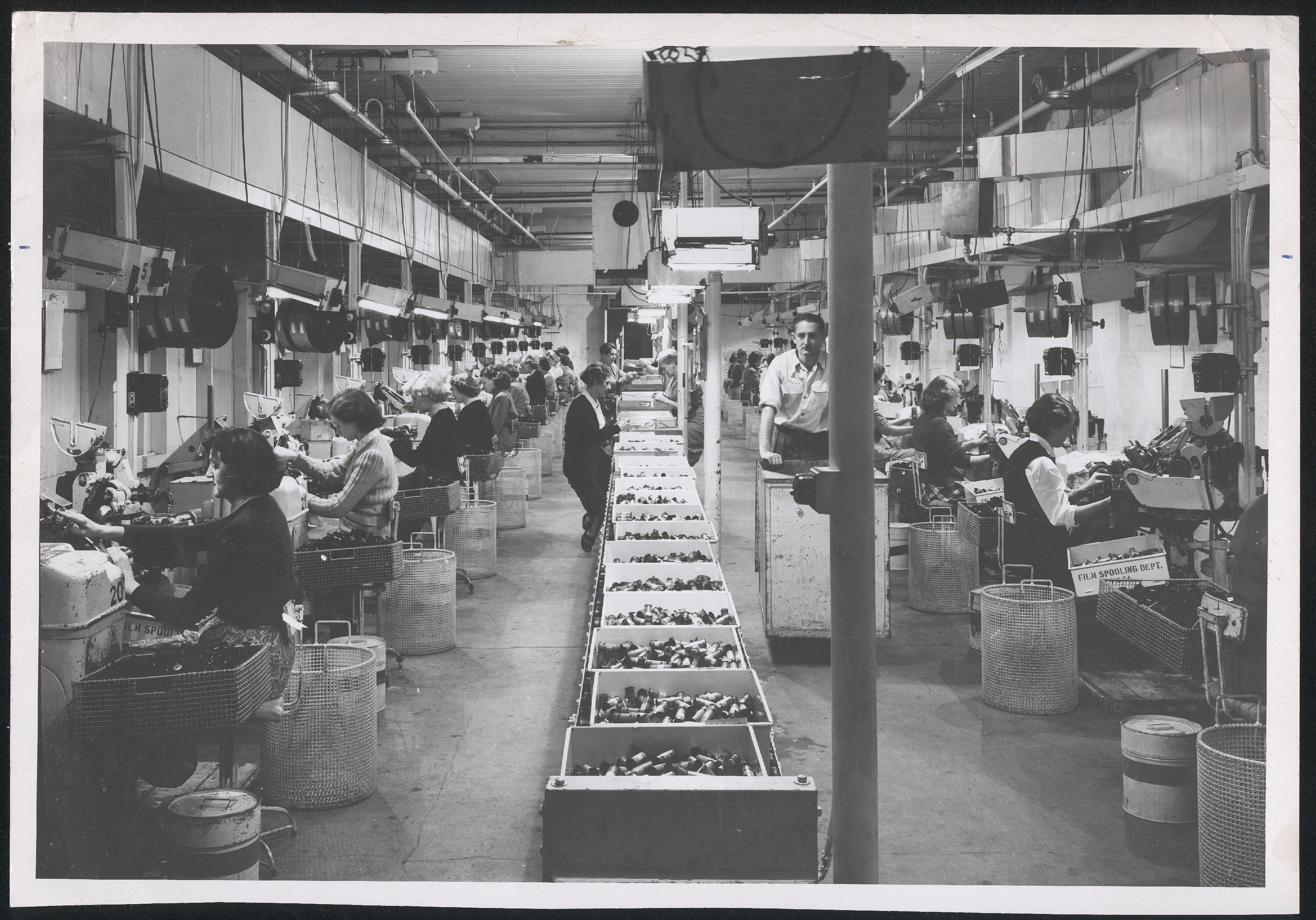 Interior view of the Kodak factory showing the Film Spooling Department. Running down the length of the room, on the outer walls, are female workers using film spooling machines, next to each of them are baskets of film. Running down the middle of the room is a conveyor belt holding boxes of film cartridges. Four women sit at the belt sorting. A male worker pushes a trolley down one of the aisles.