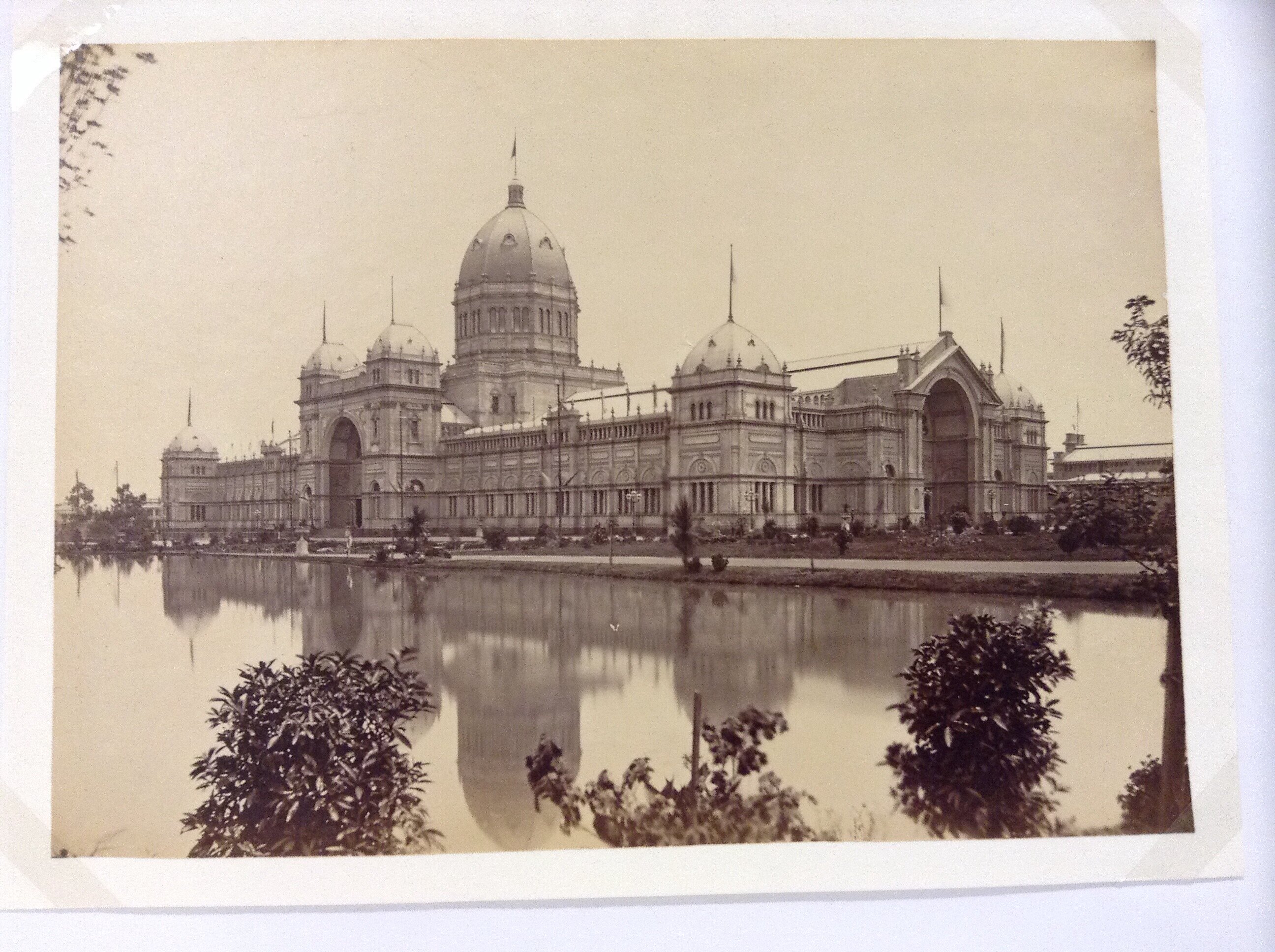 View of the Exhibition Building looking north-west from Nicholson Street taken at the time of the 1880 Melbourne International Exhibition. The original ornamental lake is visible in the foreground.