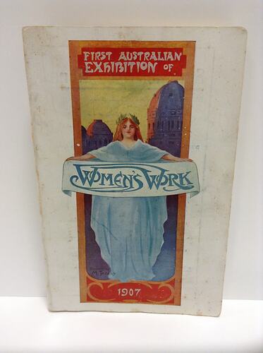 Official Souvenir Catalogue for the First Australian Exhibition of Women's Work, held at the (Royal) Exhibition Building, Melbourne, from 23 October to 30 November 1907. The exhibition included competitive and non-competitive exhibitions in a number of areas including fine arts, applied arts, photography, horticulture, literary, music and elocution, physical culture, needlework, cookery, laundry, teaching and nursing. There was also a section for trade exhibitors as well as a full program of demonstrations, events and concerts.