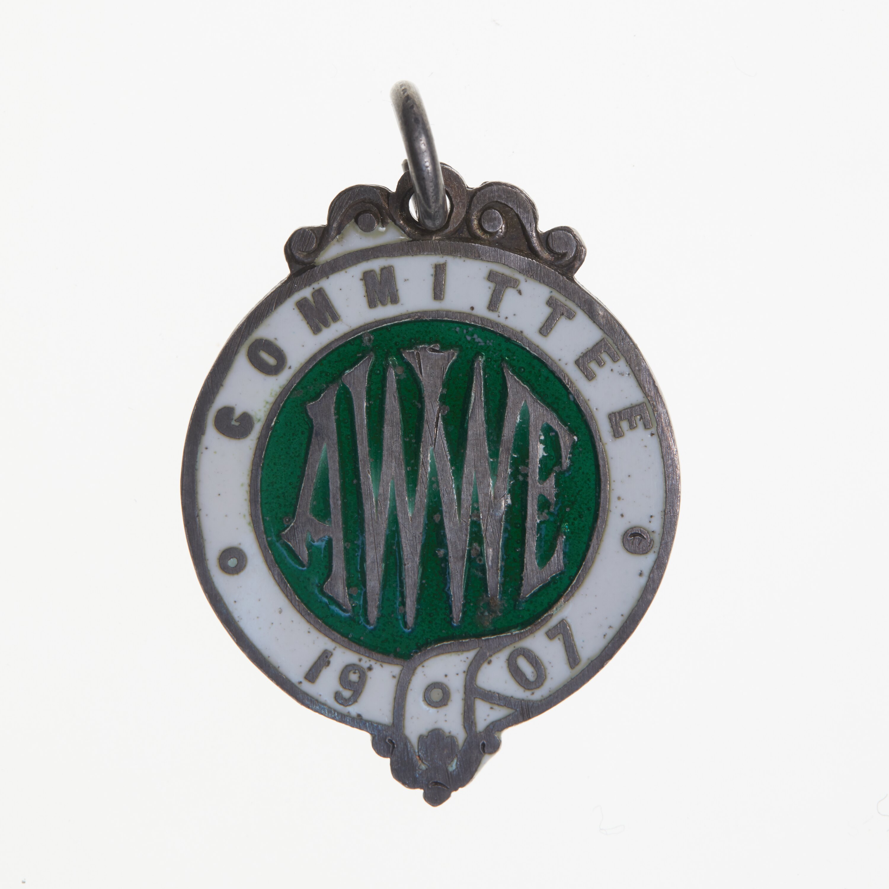 Cast enameled medallion with white around edge and the inscription: 'COMMITTEE * 1907 * dark green centre with the inscription AWWE
