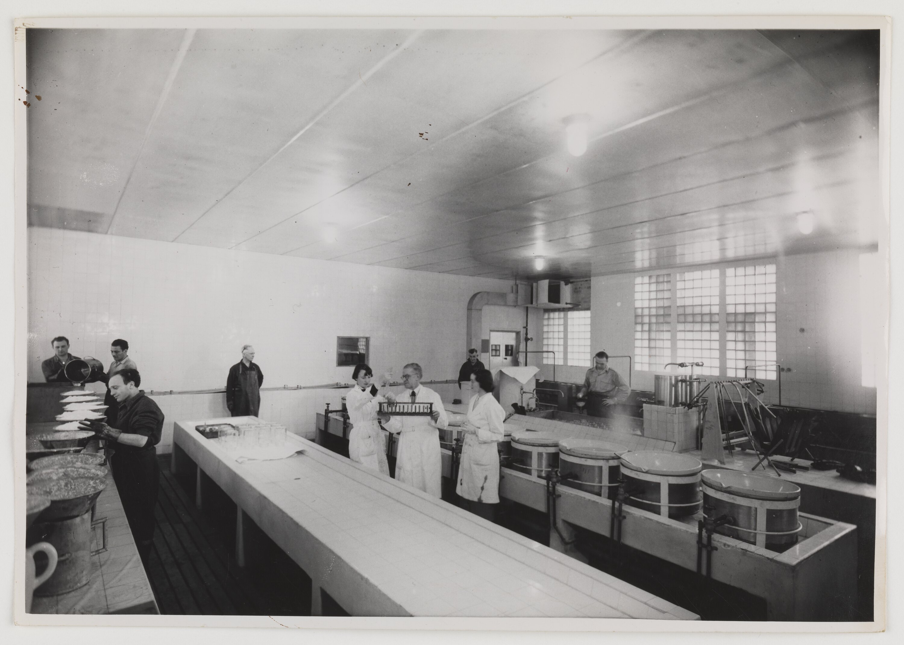 Wide angle view of the silver nitrate processing room. At the centre of the image, a man in a laboratory coat holds a rack of test tubes and two women in laboratory coats stand either side of him. To the far right, a man is pouring liquid into glass jars. At the back of the image, standing against the tiled wall are two men in overalls. To the left, one man is wearing rubber gloves and working with a white substance in metal bowls. Two men stand behind him and are pouring liquid into a square container.