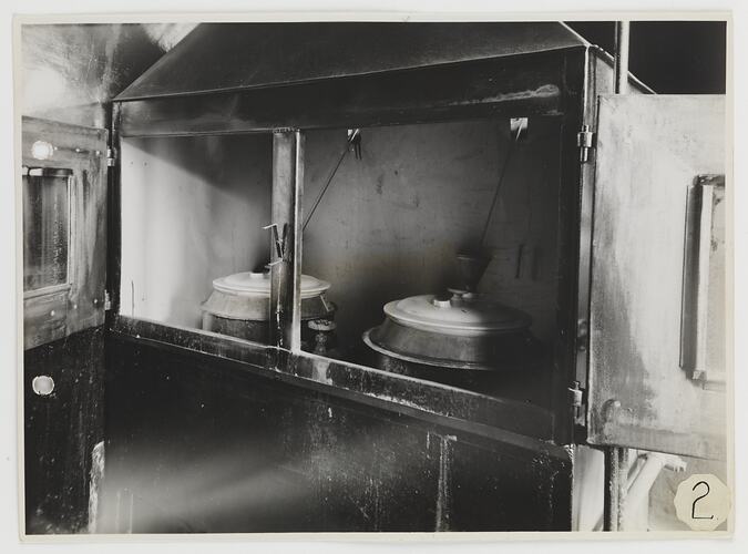 Black and white photograph featuring the inside of a metal dissolving cabinet in the Kodak Australasia Pty Ltd factory, Abbotsford. The image is number 2 in a series featuring the Silver Nitrate Department and equipment.