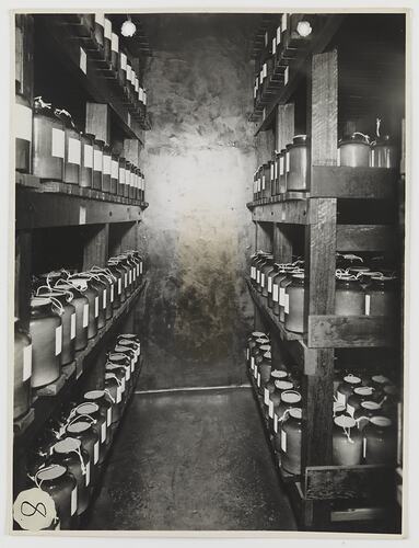 Black and white photograph featuring the nitrate storage chamber in the Silver Nitrate Department in the Kodak Australasia Pty Ltd factory, Abbotsford. The image is number 8 in a series featuring the Silver Nitrate department and equipment.