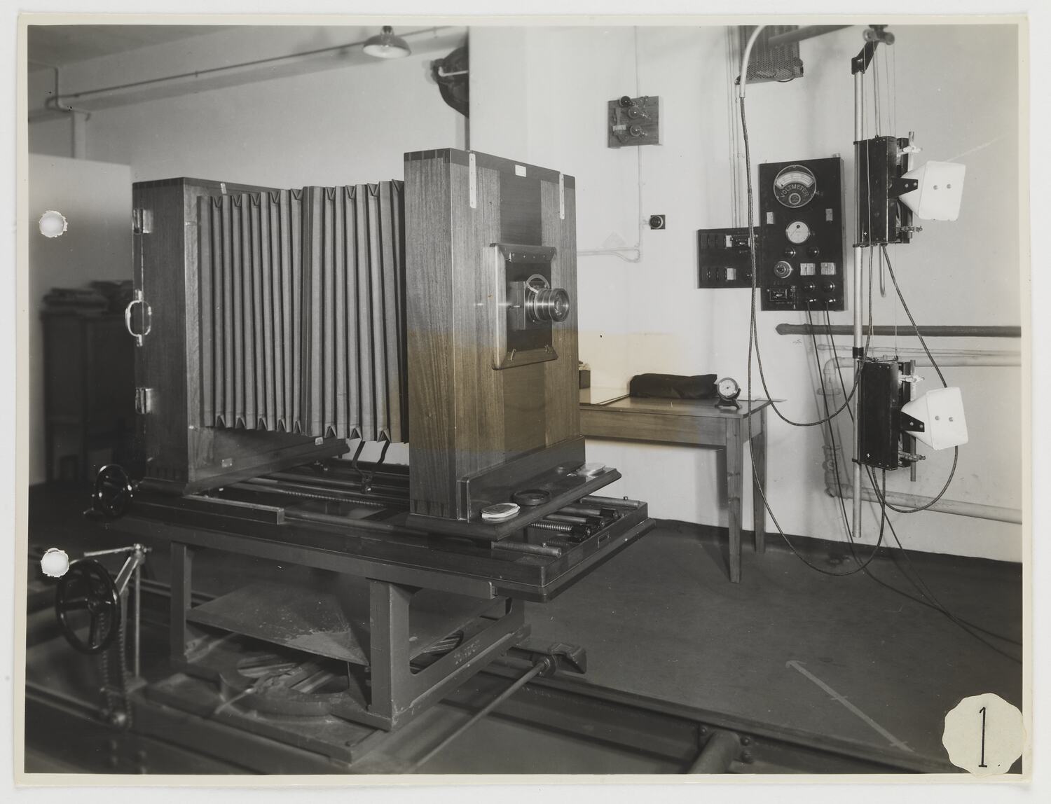 Large process camera on moving rack stand in studio with meters and dials on panel in wall in background.