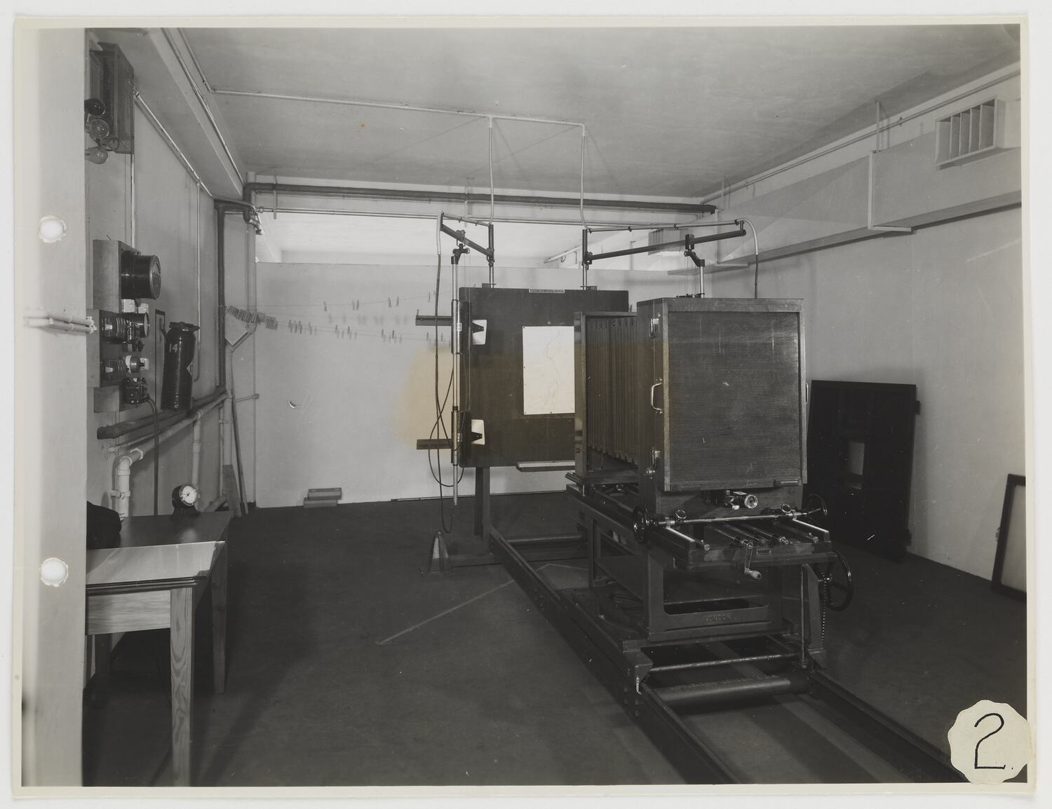 Large process camera on moving rack stand in studio with meters and dials on panel in wall at left and pegs on line strung against studio backdrop in background.