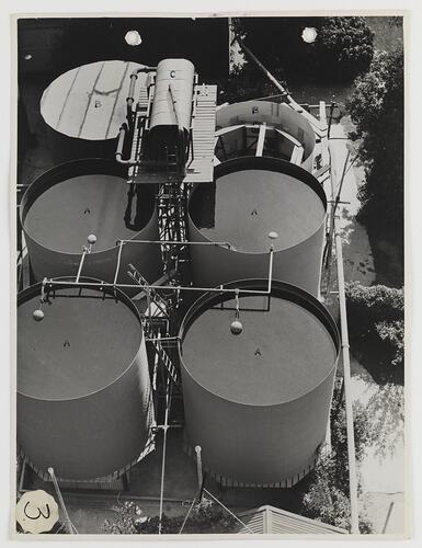 Black and white photograph of water tanks in the grounds of the Kodak Australasia Pty Ltd factory at Abbotsford, 1937-1938. The image shows sedimentation tanks, insulated chilled water storage tanks and a Bandelot cooler.