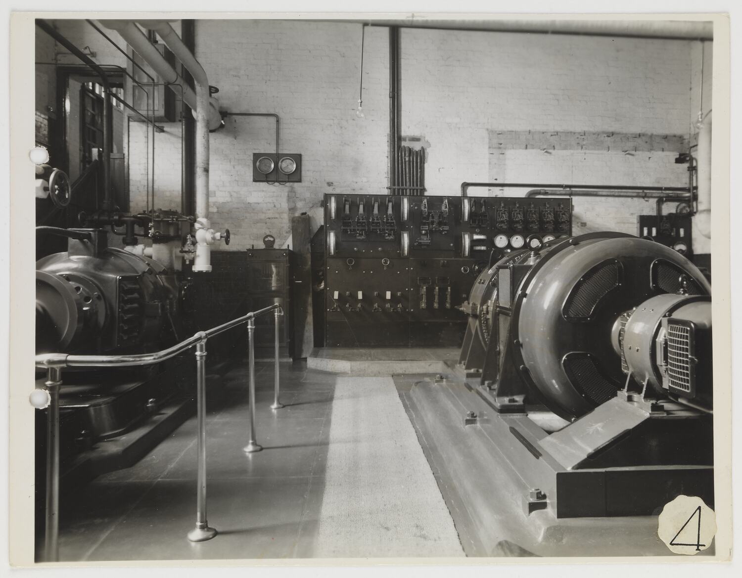 Interior view of the power house showing machinery, control panels in background and a guard rail surrounding equipment on left.