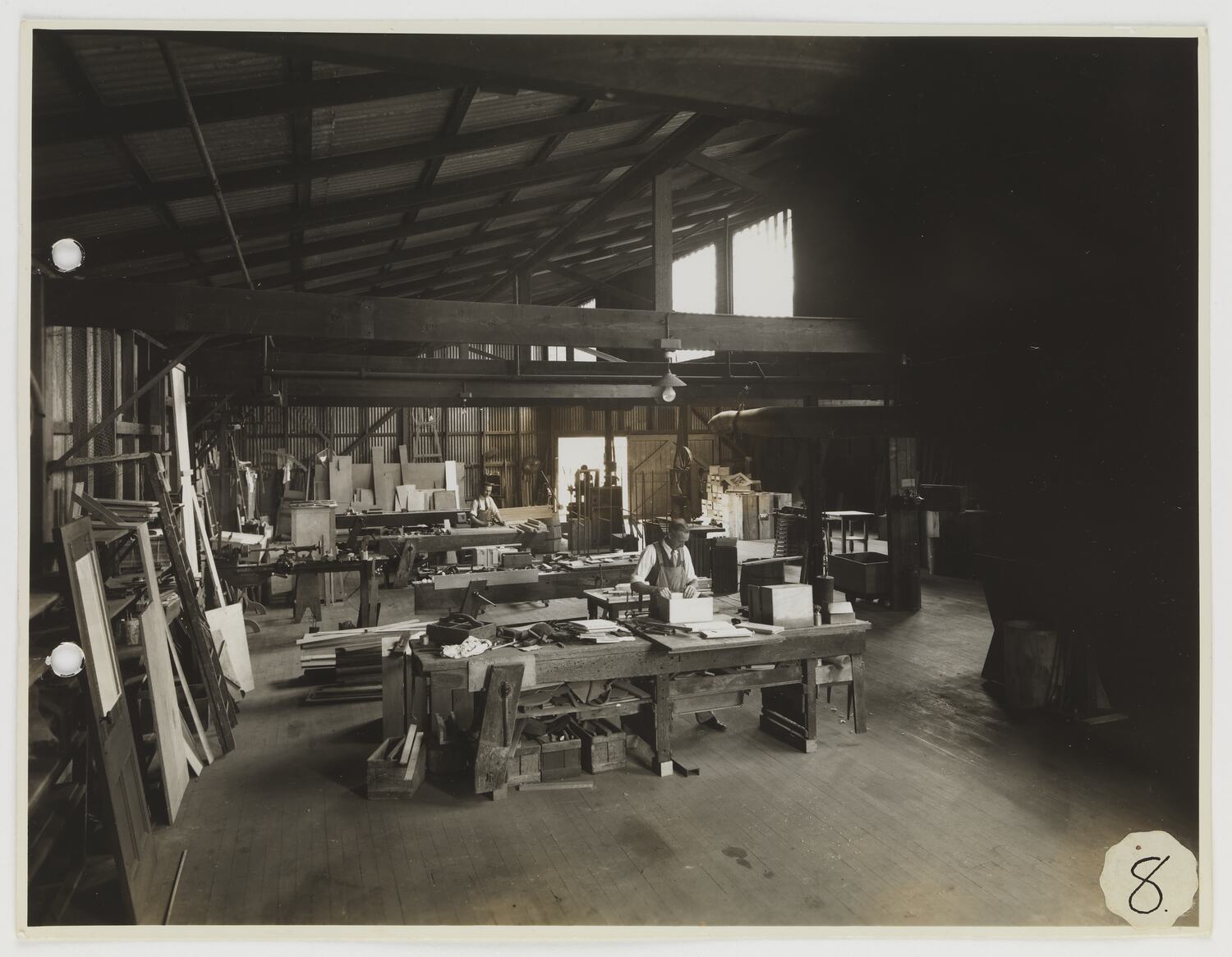Black and white photograph of the carpenters workshop at the Kodak Australasia Pty Ltd Abbotsford factory, circa 1938.