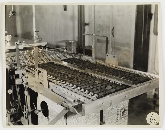 Hand written on a sticker attached to the front of the photograph; '6' Typed on a sticker attached to the back of the photograph; 'PLATE DEPARTMENT. / 6. This photograph shows a new addition to Coating Machine, designed / and built by our Engineer at Abbotsford. / The rollers are of ebonite, two rows of 8 1/2" x 6 1/2" glass can be fed / on machine, then by moving centre guide over to right side, 24" x 20" / plates and larger if necessary can be coated. / This eliminates cord lines and overlapping of plates.'