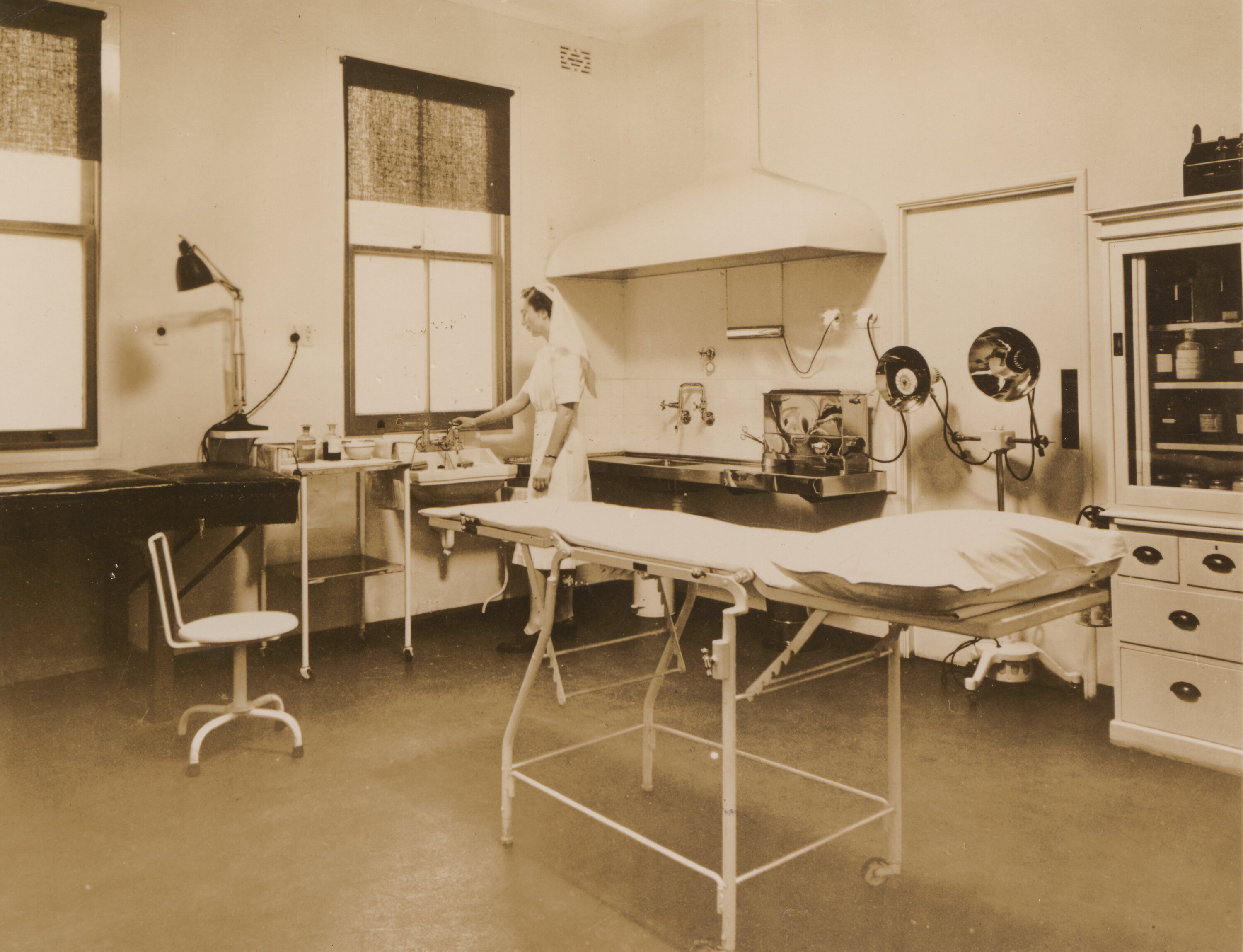 Medical room with examination table in centre, lights, sink, cupboard filled with medicines, and nurse in habit standing at sink in background.