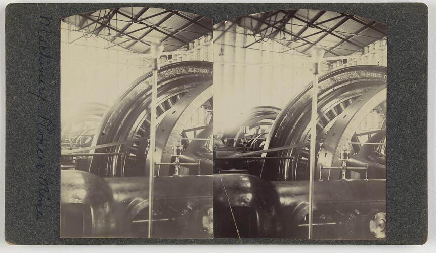Black and white stereograph of a generator at Charlotte Plains gold mine, circa 1900s.