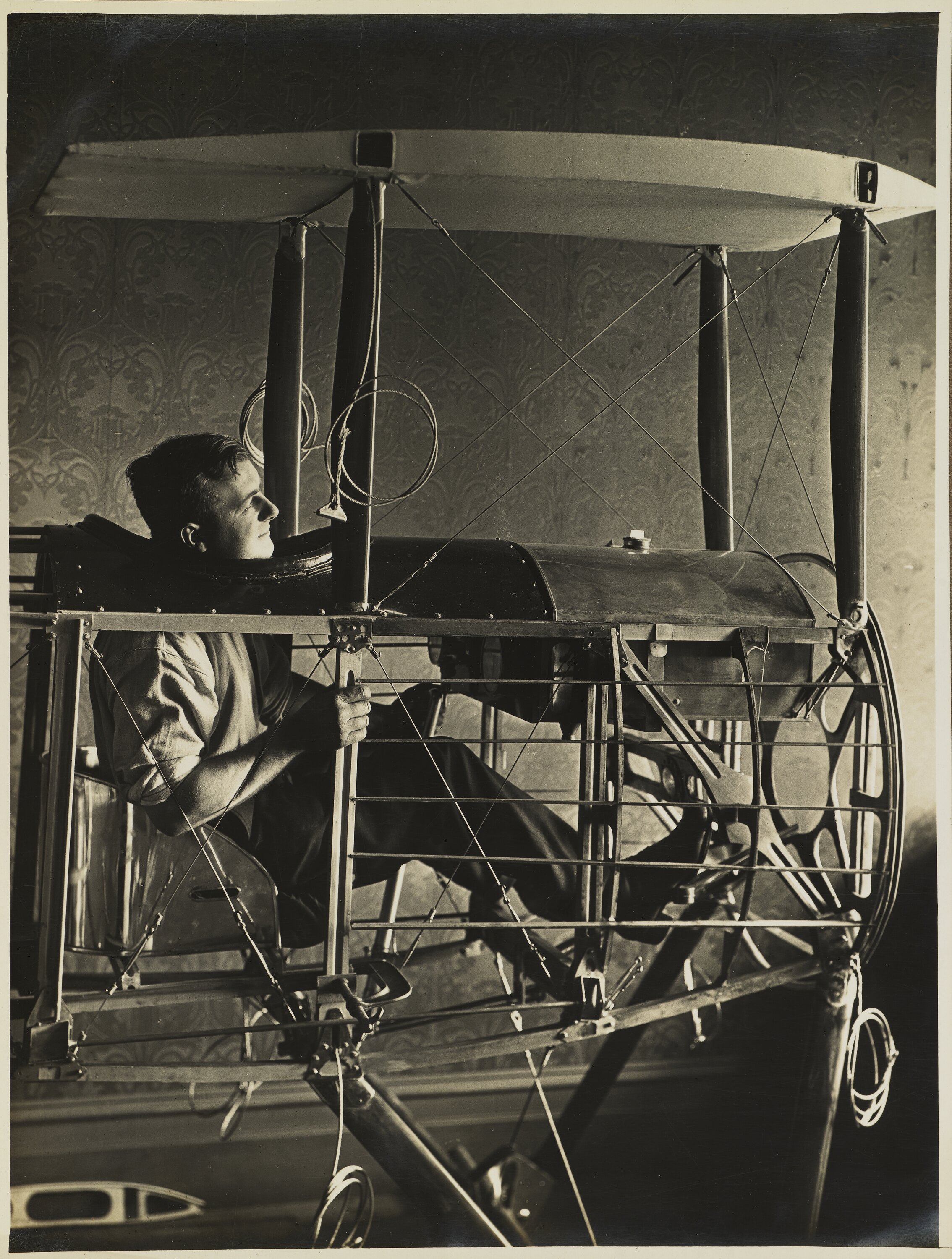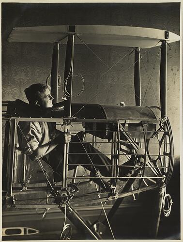 Side on portrait of Basil Waton seated in the cockpit of his partially completed biplane fuselage in the billiard room of the Watson family home 'Foilacleugh' in Elsternwick, Victoria. Watson is gazing straight ahead (to the right) over the top of the fuel tank which will supply benzine for the Gnome rotary engine he is planning to fit to the plane. His feet are resting on the rudder pedal and his left hand it gripped around the joystick, while is right hand is holding a vertical member of the timber fuselage frame. The fuselage is still an open frame, yet to be covered with its fabric and metal skin. In the background the wall is covered in dark wallpaper with an embossed 'fleur de lis' style pattern reflecting the popular architectural and home decorating style of the early 1910s.