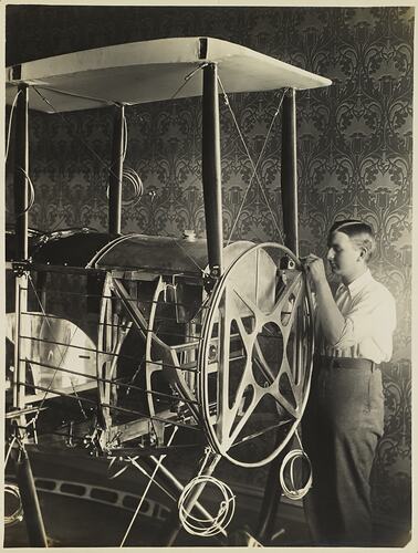 Portrait of Basil Watson fitting a circular metal engine mounting frame to the front of the partially completed fuselage of his Sopwith-type biplane in the billiard room of the Watson family home 'Foilacleugh' in Elsternwick, Victoria. The fuselage frame is built of timber struts with diagonal bracing wires in each bay, and is yet to be covered with its fabric and metal skin. A series of metal rods provides extra strength to the front end of the fuselage and protection to the cockpit. An arched metal fuel tank is fitted inside the frame above the foreward part of the cockpit. On top of the fuselage are four timber cabane struts and diagonal wire bracing, supporting the central section of the upper wing. Watson's plane was design so that the wings could be removed from the fuselage for ease of transport by road. The background wall is covered in wallpaper with a dark embossed 'fleur de lis' style pattern reflecting the popular architectural and home decorating style of the early 1910s.