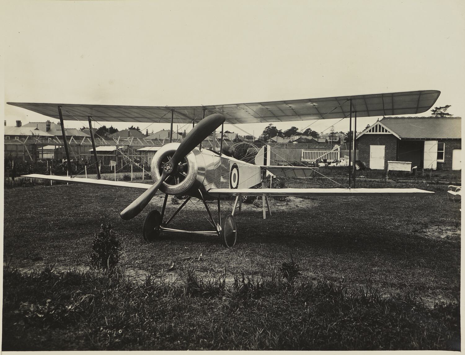 Part of a commemorative photograph album produced by Sears' Studios, Melbourne, documenting the work of Basil Watson in constructing a biplane at his family's home 'Foilacleugh' in Elsternwick, Victoria, during 1916, and the aftermath of his fatal crash off Point Cook on 28th March 1917. The biplane was based on the design of the Sopwith Pup, which Watson was familiar with from his time working as an engineer and test pilot with the Sopwith Aviation Co. and Imperial Army in Britain, during 1914-1916. Watson piloted the plane on pioneering flights to Bendigo and western Victoria. He performed many public acrobatic flying demonstrations and flew the first official airmail between Mt Gambier and Melbourne in February 1917. He was killed when a component of his aircraft failed during an aerobatic demonstration over Point Cook, Victoria, on 28th March 1917, causing the wings to collapse, plunging the aircraft into Port Phillip Bay. His death was the earliest recorded aviation fatality in Australia. His death deeply affected the Watson family, who continued to publish tribute notices in Melbourne's daily newspapers on each anniversary for over a decade.
