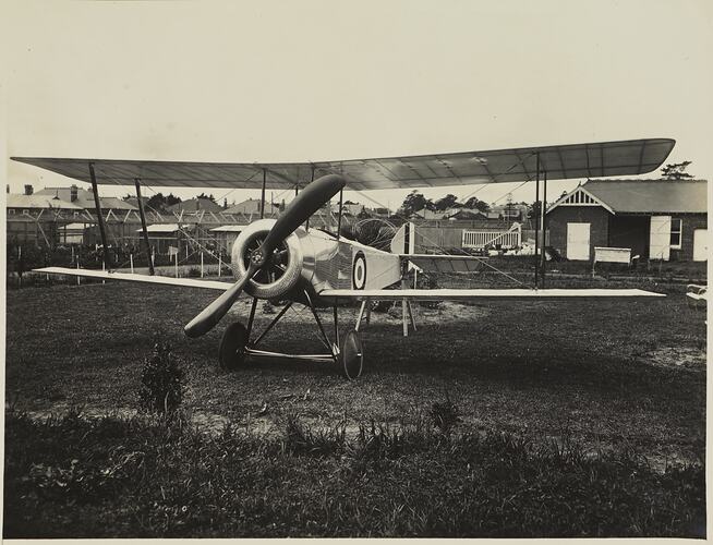 Oblique left-hand front view of Basil Watson's completed Sopwith-type biplane on the lawn behind the Watson family home 'Foilacleugh' in Elsternwick, Victoria. The rear of the fuselage is propped up on a wooden saw horse. Details seen in the photo include the laminated Circassian walnut propeller that was made for Watson by the timber merchants James Moore & Sons, of City Road, South Melbourne, and the seven-cylinder Gnome rotary engine behind the engine cowling. Of particular note is the tri-colour [presumably red, white & blue] roundel on the side of the fuselage and tri-colour vertical stripes on the rudder, reflecting standard military aviation markings that were only introduced by the British and Australian Air Corps in mid 1915. It is unclear why as a civilian aircraft Watson's plane used these markings, however, it might reflect his former association with military aviation in Britain or his plans to fly the plane out of the AFC Cenrtral Flying School airfield at Point Cook. There are no civilian registration markings on the plane (which were not required in Ausrtalia until 1921), although Watson did apply for offical registration of the aircraft in October 1916. In the background part of the Watsons' extensive garden can be seen, including a hen house and chook yard and a weatherboard building that was the family's motor garage and workshops, as well as the rear of other houses on St Kilda Street, Elsternwick.