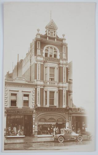 Street view of high rise buildings, with Pianola building in the centre of frame. A car is parked on the street out front people are walking or standing along the footpath. James Thelwell clothing store at left, Coles library to the right.