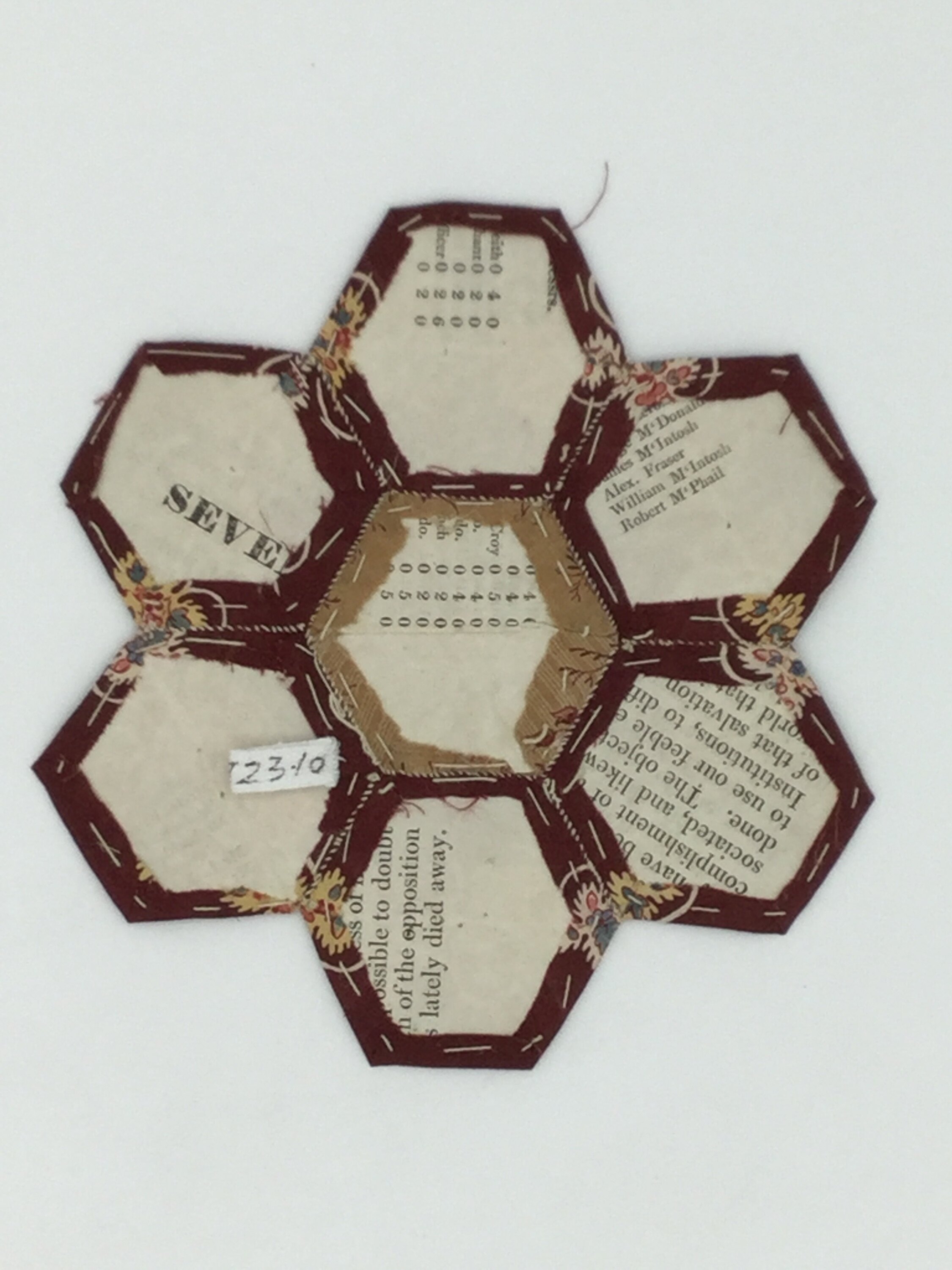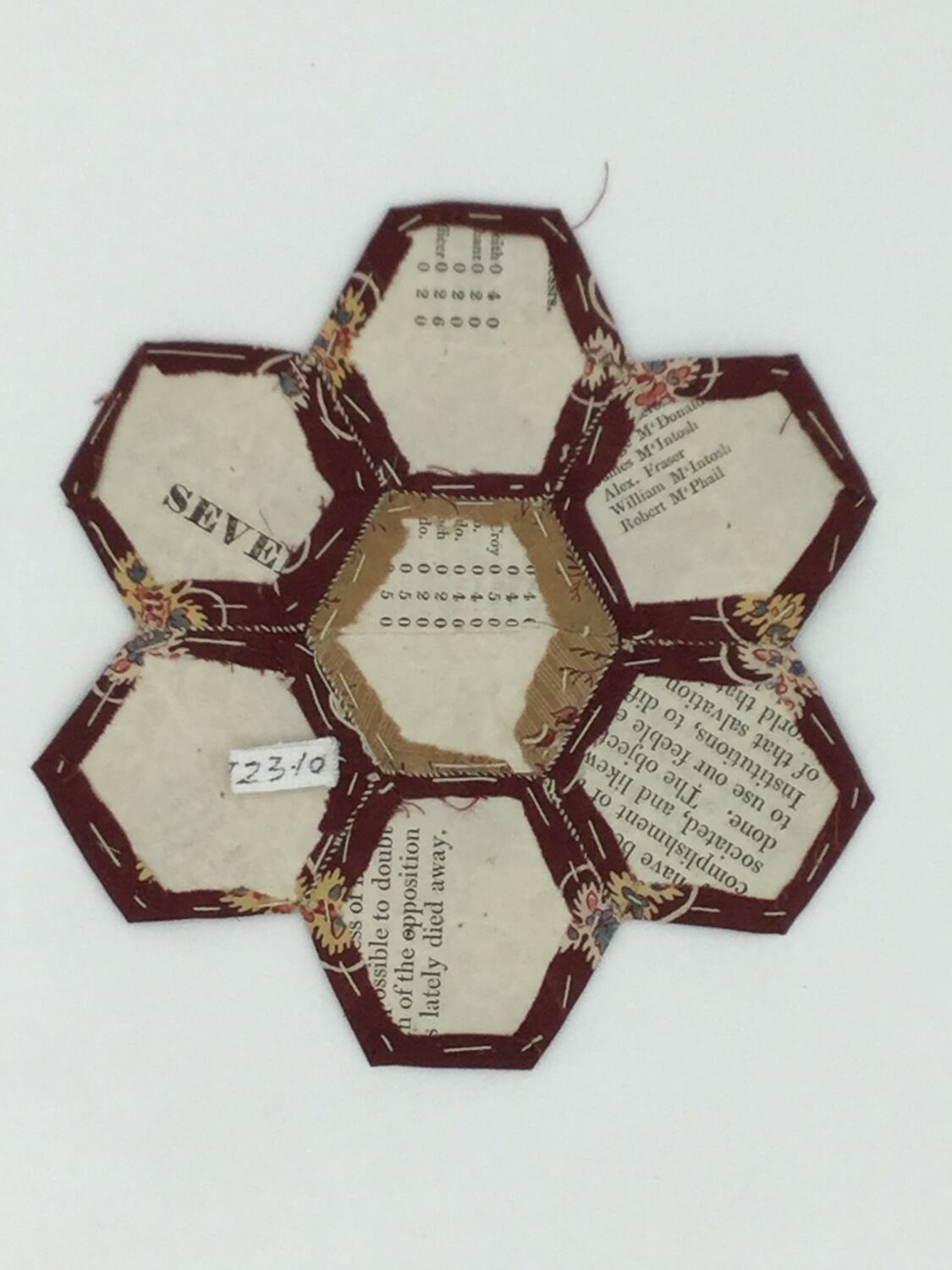 Small hexagonal fabric patch hand-sewn together, backed with paper recycled from printed publications.