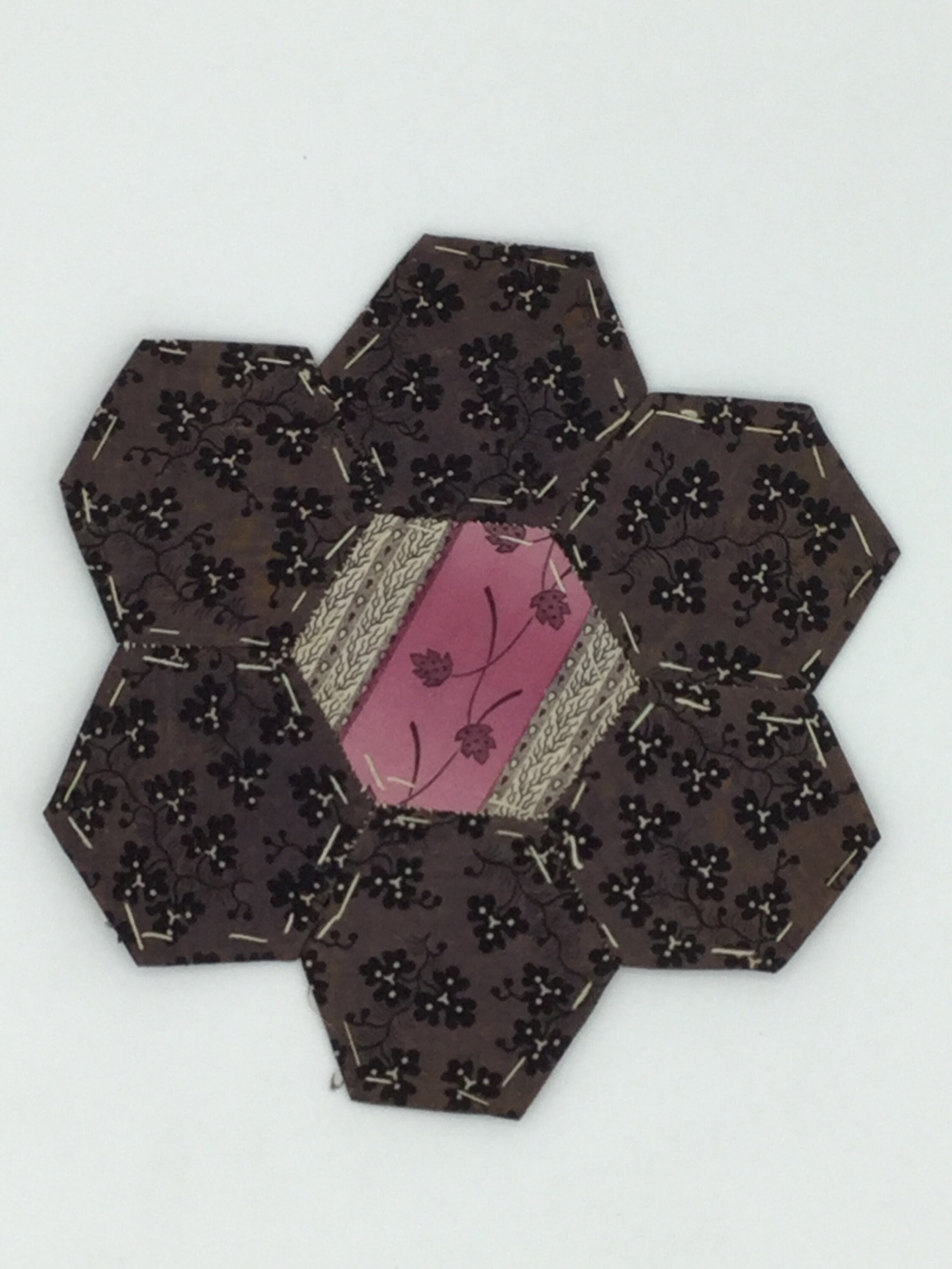 Small hexagonal fabric patch hand-sewn together, backed with paper recycled from printed publications.