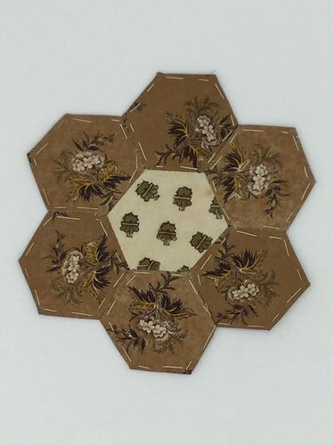 Small hexagonal fabric patch hand-sewn together, backed with paper recycled from printed publications.